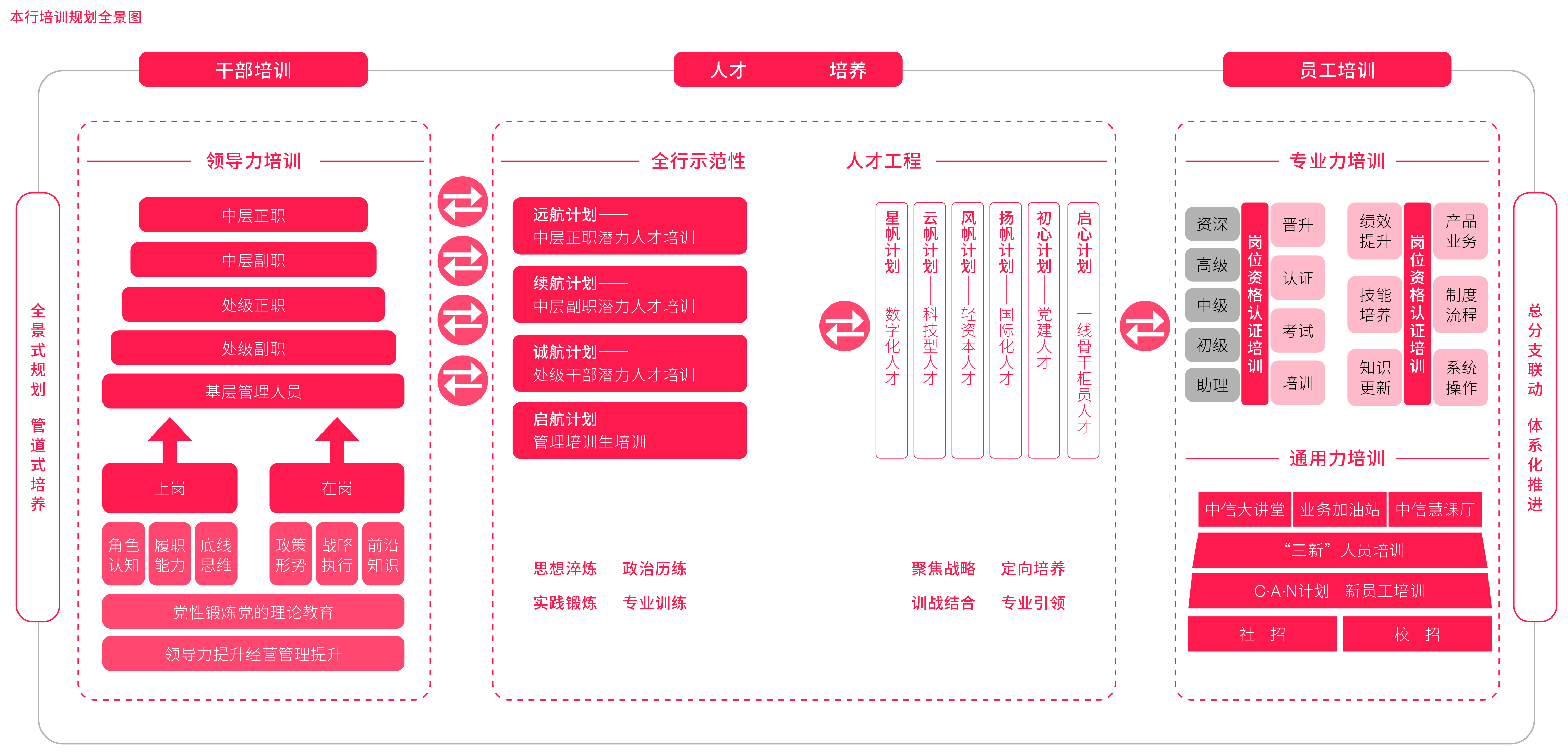 本行坚持“政治过硬、能力过硬、作风过硬”的标准,围绕“锻造忠诚干净担当的高素质专业化金融干部人才队伍”目标,主要依托“上岗+在岗”干部培训体系,持续强化对各级干部的领导力培养。