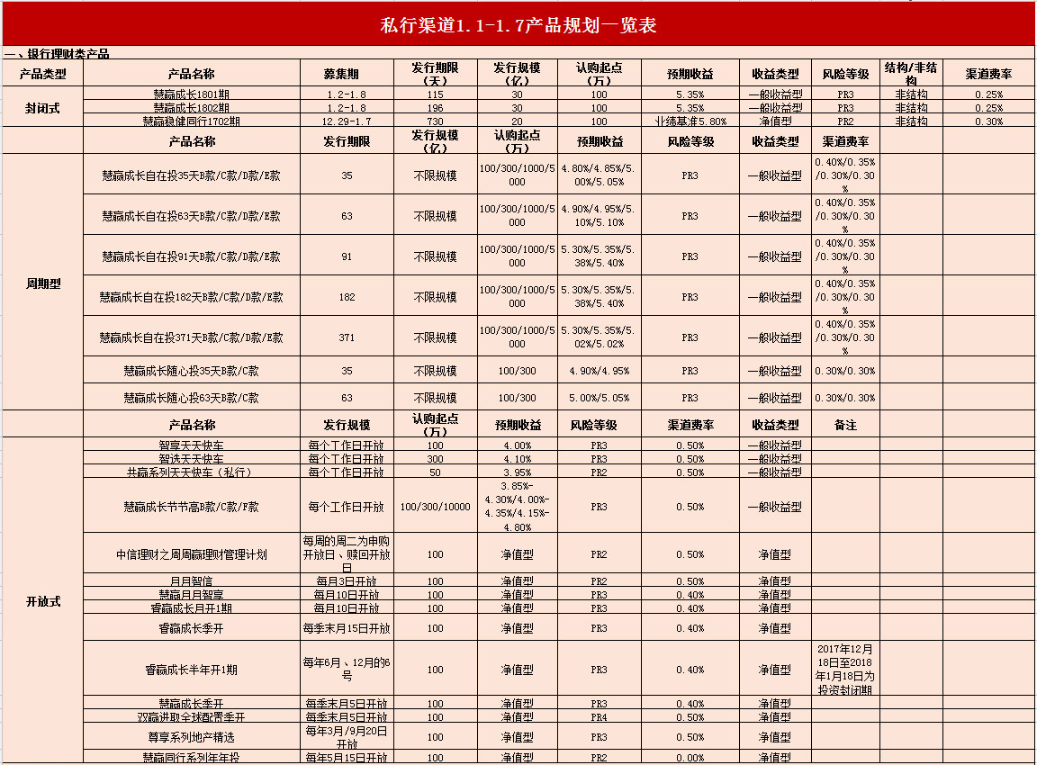 私行渠道1.1-1.7产品规划一览表