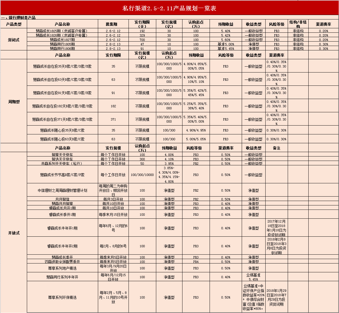 私行渠道2.5-2.11产品规划一览表