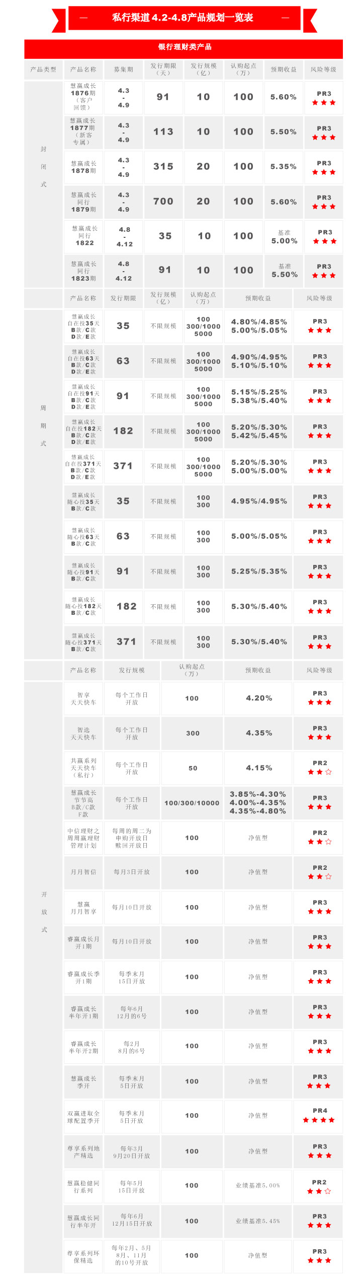 私行渠道4.2-4.8产品规划一览表